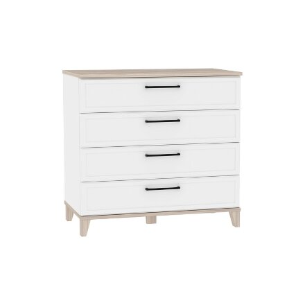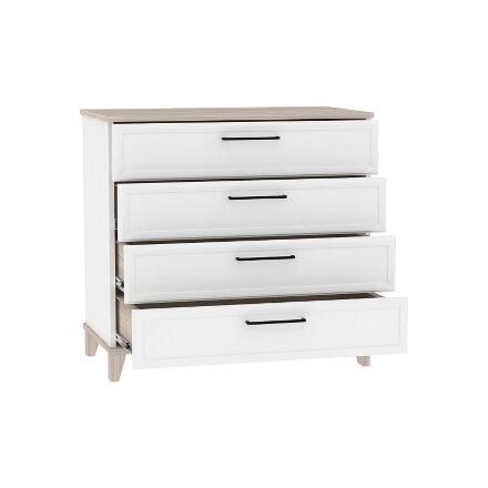 в тонком профиле МДФ, верх и низ модулей выполнены в древесном декоре. Всё это придаёт комоду легкость и лаконичность. Шариковые направляющие полного выдвижения в ящиках обеспечивают плавный, мягкий, бесшумный ход на протяжении всего срока эксплуатации. Донья ящиков в древесном декоре придают мебели коллекции Aurelio дополнительную эстетику.